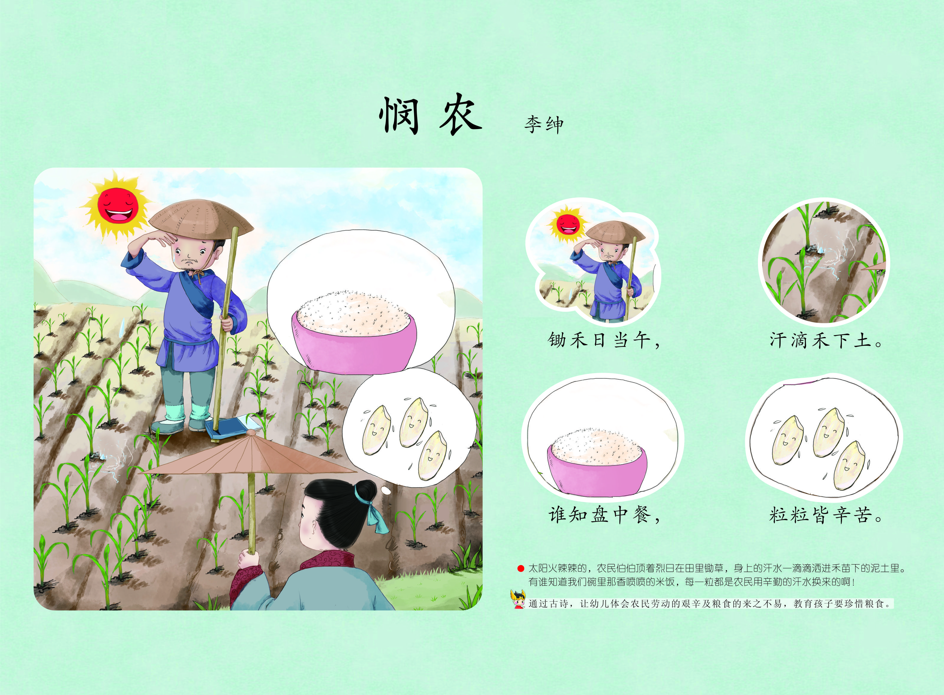 4. 《悯农》 - 李绅 锄禾日当午,汗滴禾下土。 谁知盘中餐,粒粒皆辛苦。